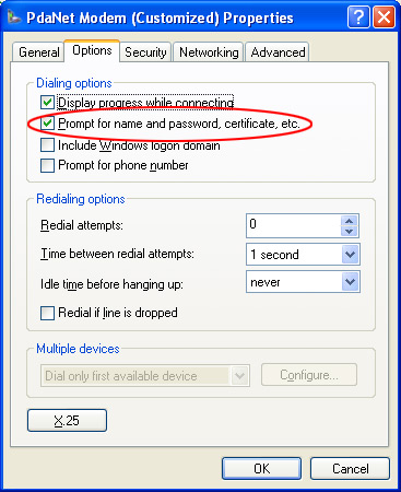 Step 4: Change the settings in Network Connections to whatever you need. For example, 1. Check "Prompt for Password and Username" so that you can supply necessary login information. 2. Enable Firewall on PdaNet connection. 3. Make sure PdaNet connection is bound to the correct "PdaNet Modem"
